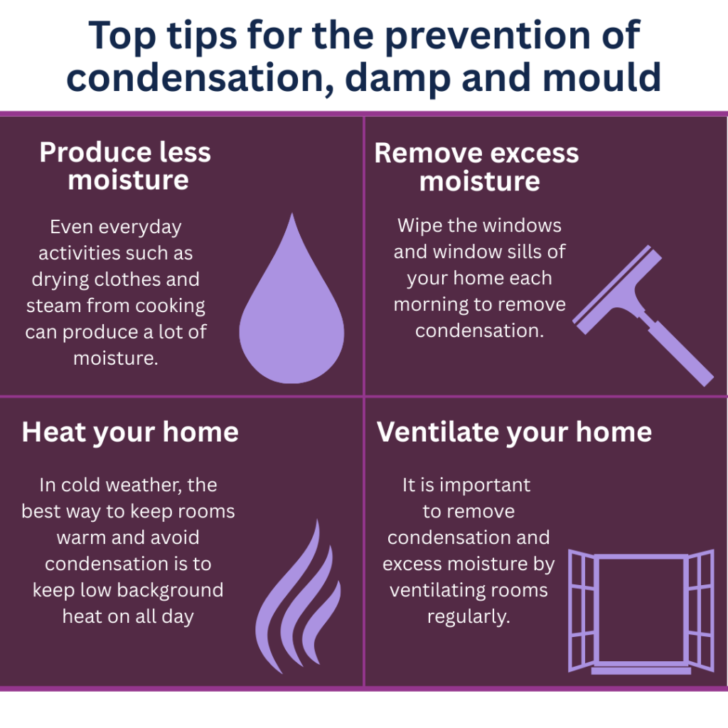 Over the last few years we have made substantial progress in tackling damp and mould that has been reported to us. Condensation is usually the biggest cause of damp within homes, and we know this often increases in colder months of the year. There are 4 key steps that you can take to prevent condensation, damp and mould in your home.
